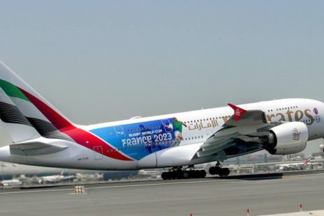 Transport Aérien Emirates se met aux couleurs de la coupe du monde de rugby 2023 Partenaire de la coupe du monde de rugby qui aura lieu en France à l’automne 2023, Emirates a habillé l’un de ses Airbus A380 aux couleurs de l’événement. 18 mai 2023 par Aerobuzz