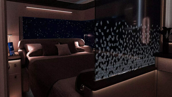 Au cœur de ce concept figure une « Master Suite » positionnée entre les deux allées, capable d’accueillir deux passagers. Cette suite propose des équipements rarement réunis dans l’aviation commerciale : lit double, espace bar, espace de change et sanitaires dédiés. L’ensemble s’inscrit dans une configuration en « 1-1-1 », rendue possible par une optimisation complète de la zone située entre les portes 1 et 2.