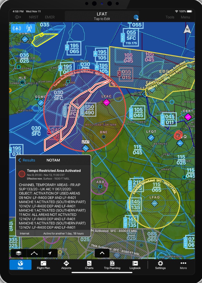 Les NOTAM sont désormais affichés sur la carte mobile et depuis la page "plan de vol" sous forme brute ou décodée. © Garmin