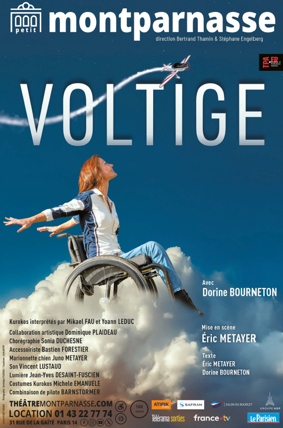 Au Théâtre du Petit Montparnasse, Dorine Bourneton propose depuis le 28 janvier 2026 son seul en scène Voltige. Une autre manière de présenter son parcours fait de résilience. Celui d'une adolescente de 16 ans, qui va survivre à un crash d’avion et devenir paraplégique. Des années plus tard, elle deviendra la première femme paraplégique au monde pilote de voltige. Au-delà de l'aviation…