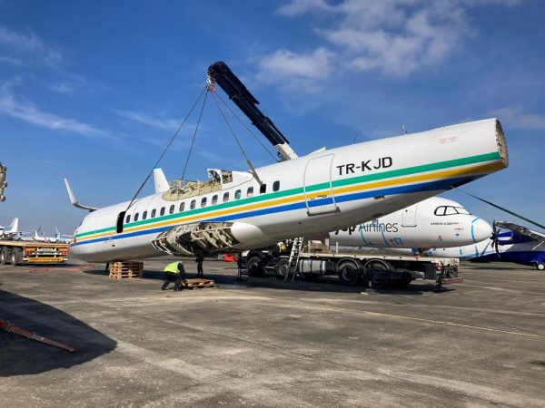 L’appareil est l’ATR 42 MSN 131 qui a volé pour la Garde Présidentielle du Gabon. Convoyé pour stockage vers Francazal il y a un peu plus d’un an, l’appareil s’est avéré trop endommagé pour reprendre du service et a donc été démantelé partiellement et son fuselage acquis, donc, par son heureux nouveau propriétaire. A noter que cet appareil avait la particularité d’être le seul ATR disposant d’une porte pouvant être ouverte en vol, offrant à cet avion la possibilité de larguer, éventuellement, des parachutistes.