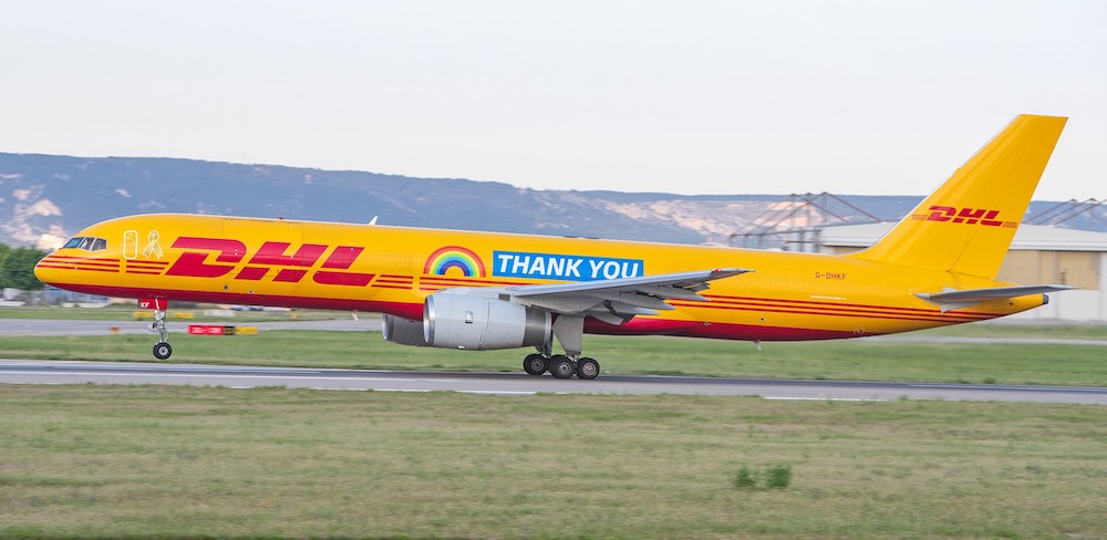 DHL Express affiche ses remerciements aux « héros du quotidien » sur les flancs d’un Boeing 757F affecté au réseau européen.