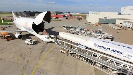 Une partie de la voilure du premier A350XWB embarquée à bord d’un Beluga