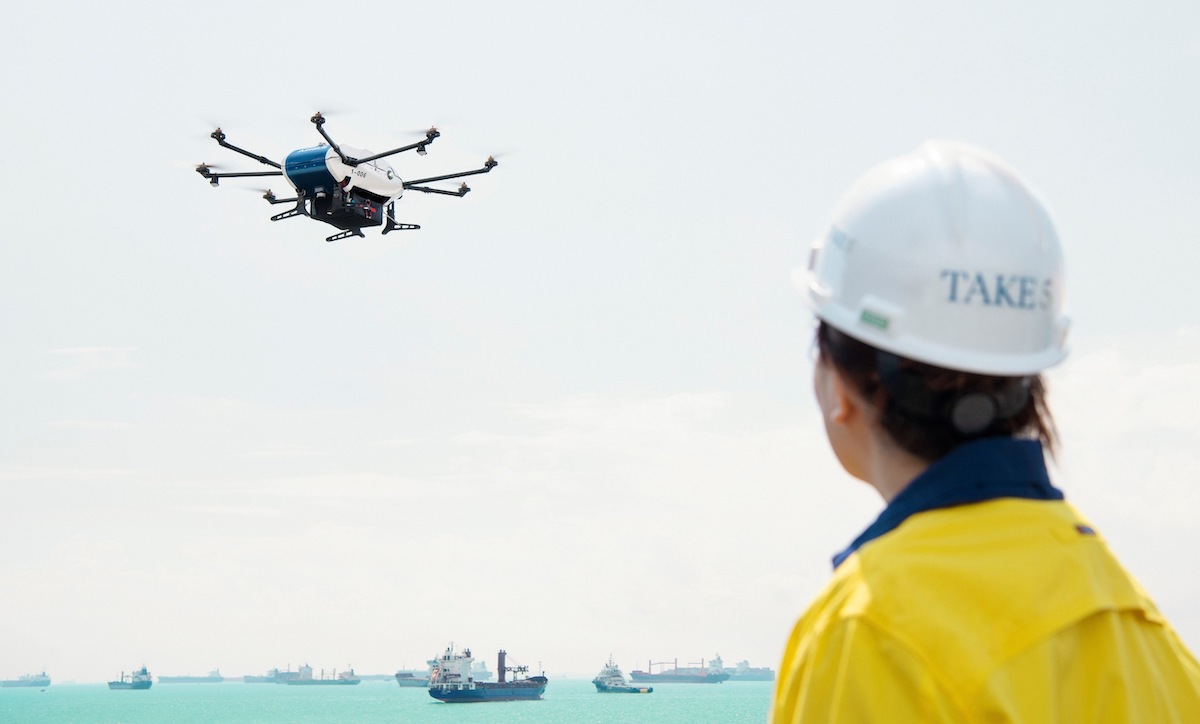 Dans la baie de Singapour, Airbus a effectué une première livraison de colis à bord d’un navire au mouillage, à l’aide d’un drone dans le cadre du programme d’expérimentation Skyways.