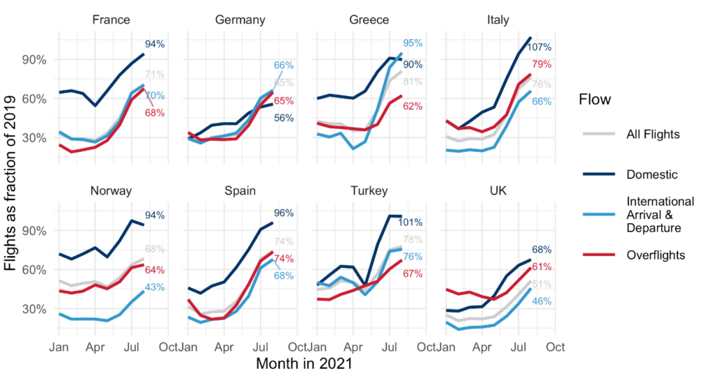 Eurocontrol a publié les chiffres du trafic aérien en Europe pour le mois d'août 2021. Les vols atteignaient 71% des trafics comptabilisé en 2019. Les différences entre pays demeurent toutefois très fortes.